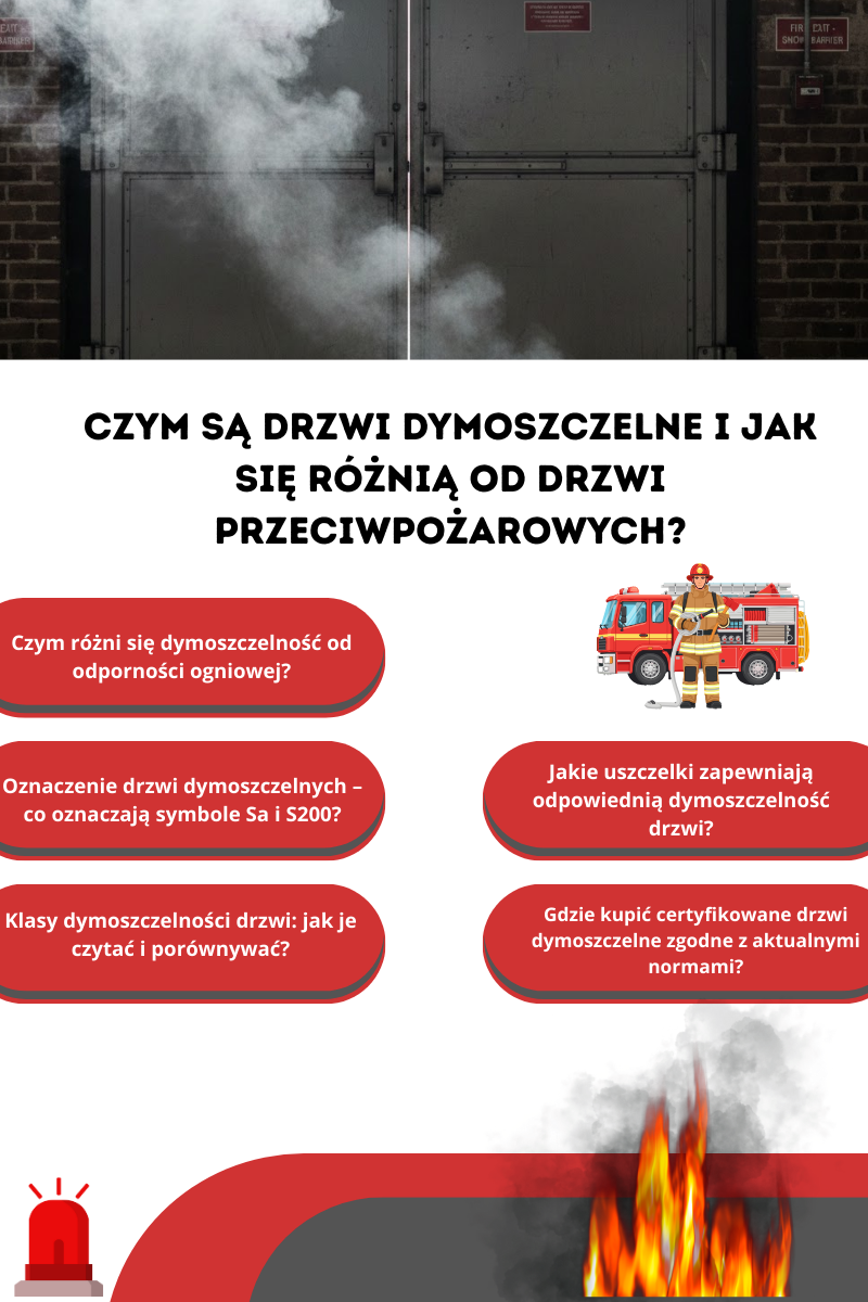 Dowiedz się, czym różni się dymoszczelność od odporności ogniowej, jak czytać oznaczenia Sa i S200, jak działają uszczelki i w jakich przypadkach drzwi dymoszczelne są niezbędne.