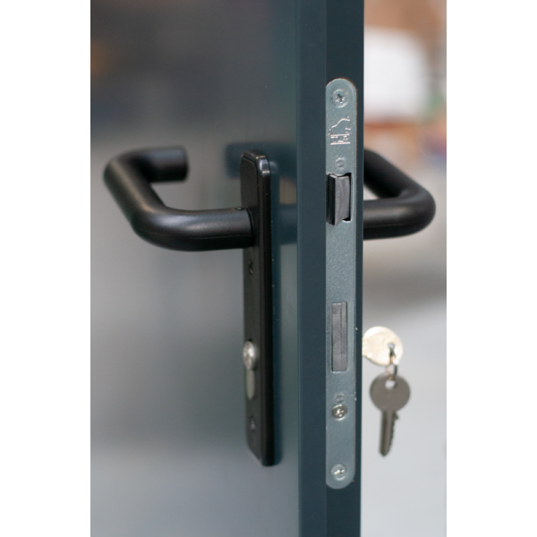 - zamek zapadkowo-ryglowy, przygotowany pod montaż wkładki patentowej, klamka na szyldzie krótkim prostokątnym z tworzywa sztucznego w kolorze czarnym